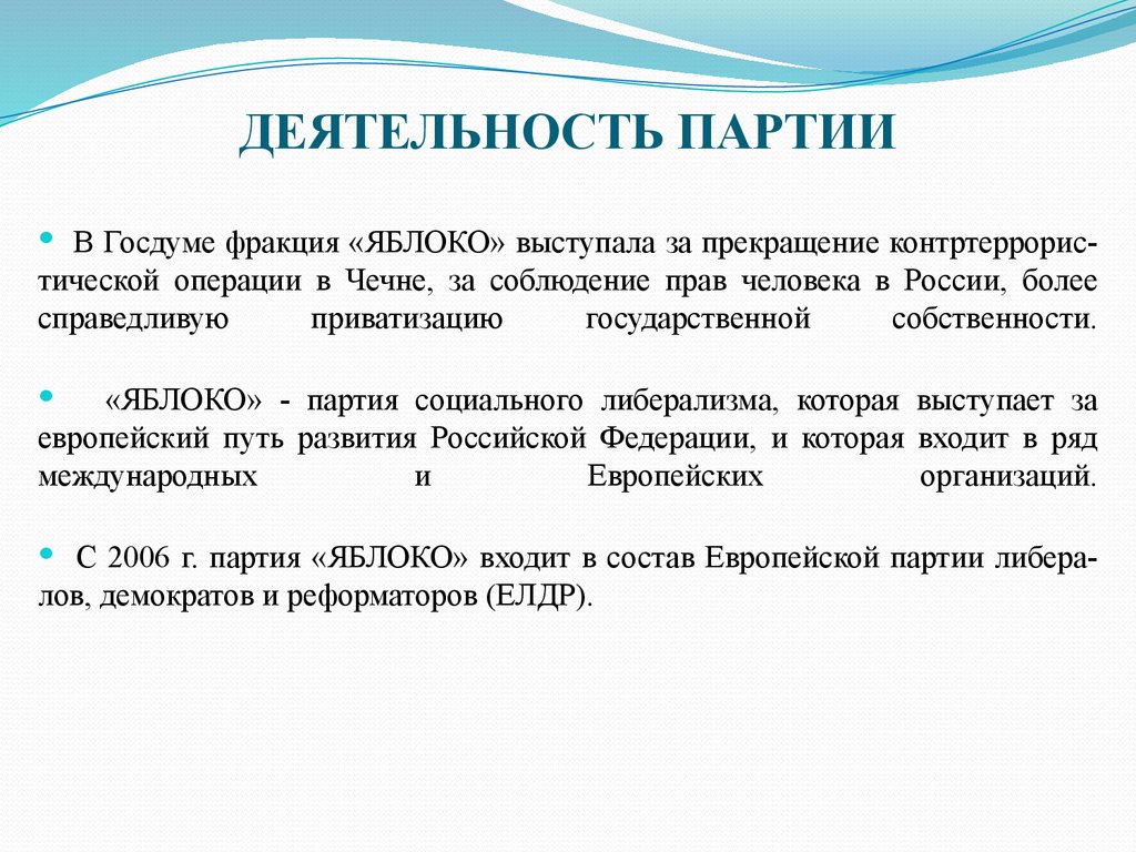 ДЕЯТЕЛЬНОСТЬ ПАРТИИВ Госдуме фракция «ЯБЛОКО» выступала за прекращение контртеррорис-