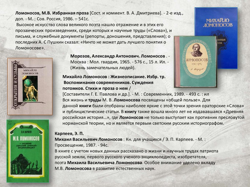 Ломоносов, М.В. Избранная проза [Сост. и коммент. В. А. Дмитриева]. - 2-е изд.,доп. - М. : Сов. Россия, 1986. – 541с.