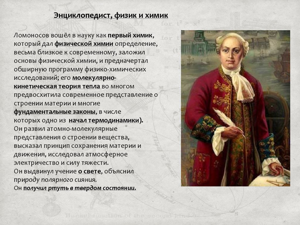 Энциклопедист, физик и химикЛомоносов вошёл в науку как первый химик,