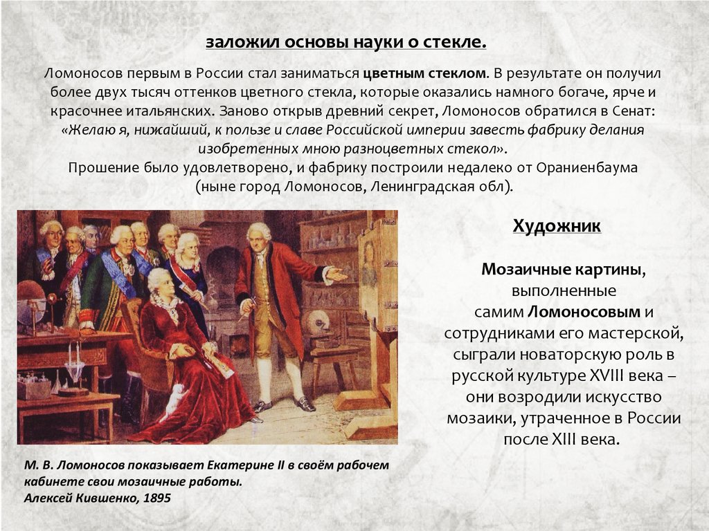 заложил основы науки о стекле.Ломоносов первым в России стал заниматься цветным стеклом. В результате он получил