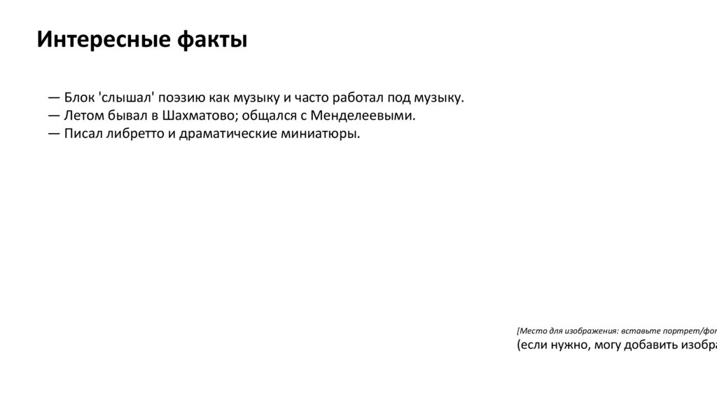 Интересные факты— Блок 'слышал' поэзию как музыку и часто работал под музыку.