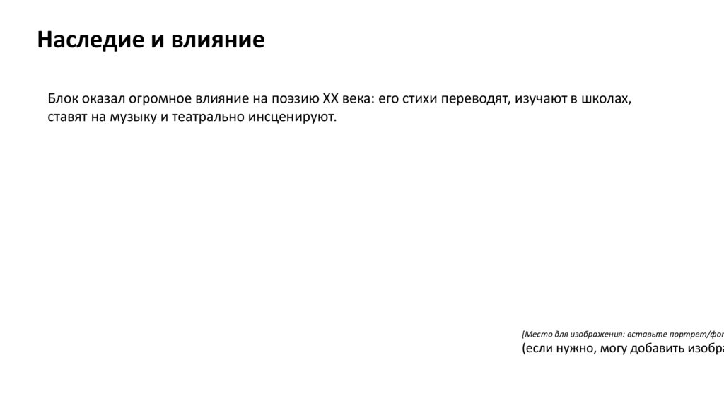 Наследие и влияниеБлок оказал огромное влияние на поэзию XX века: его стихи переводят, изучают в школах,