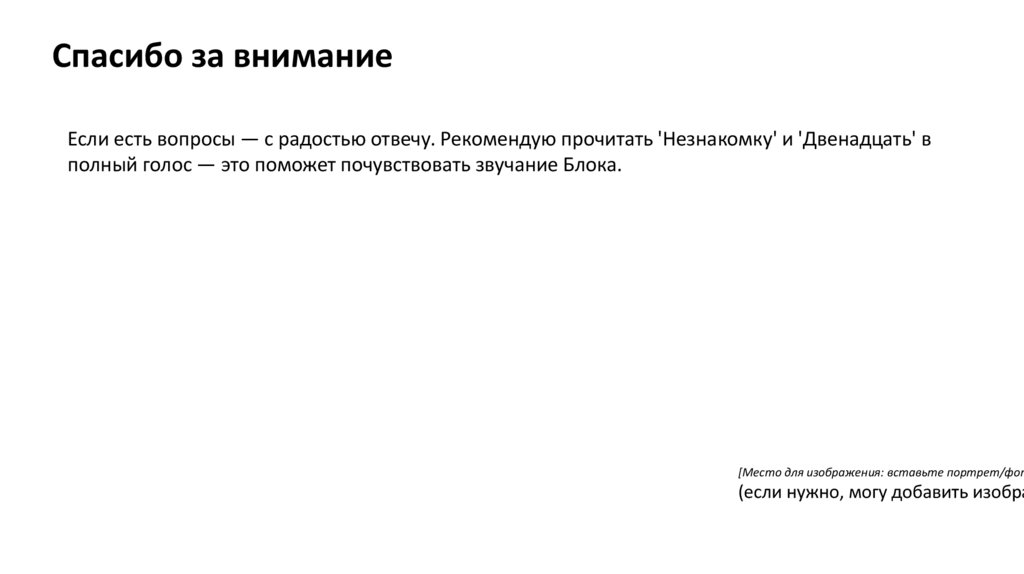 Спасибо за вниманиеЕсли есть вопросы — с радостью отвечу. Рекомендую прочитать 'Незнакомку' и 'Двенадцать' в