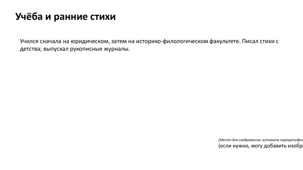 Учёба и ранние стихиУчился сначала на юридическом, затем на историко-филологическом факультете. Писал стихи с