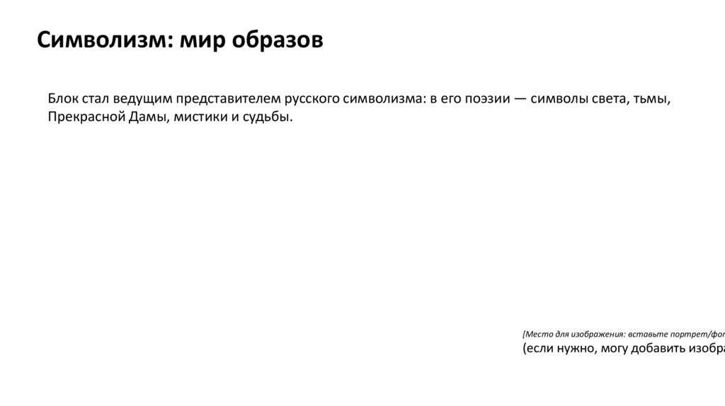 Символизм: мир образовБлок стал ведущим представителем русского символизма: в его поэзии — символы света, тьмы,