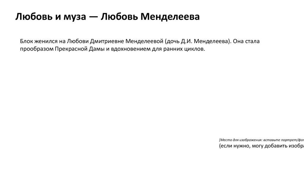Любовь и муза — Любовь МенделееваБлок женился на Любови Дмитриевне Менделеевой (дочь Д.И. Менделеева). Она стала