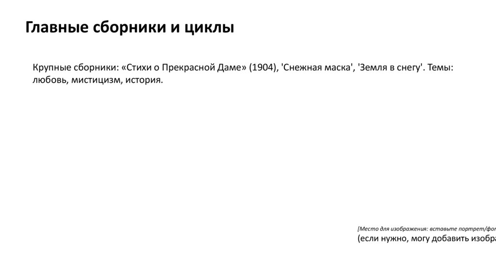 Главные сборники и циклыКрупные сборники: «Стихи о Прекрасной Даме» (1904), 'Снежная маска', 'Земля в снегу'. Темы: