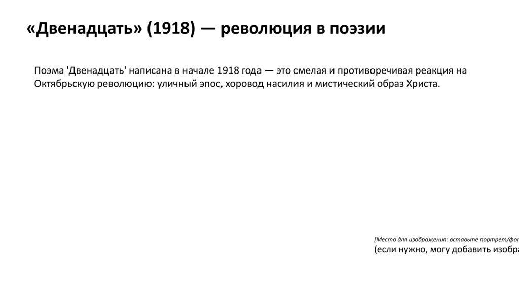 «Двенадцать» (1918) — революция в поэзииПоэма 'Двенадцать' написана в начале 1918 года — это смелая и противоречивая реакция на