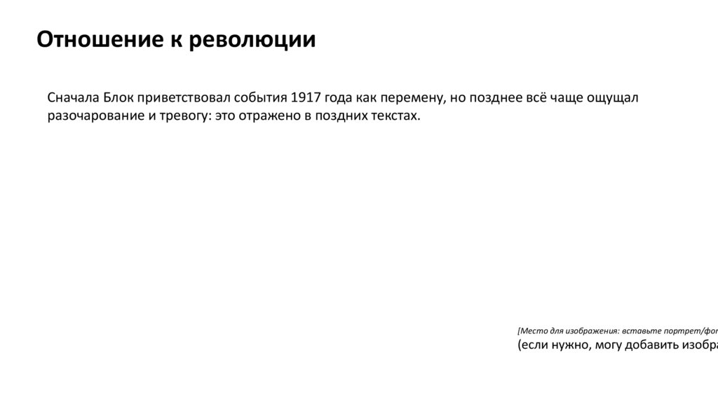 Отношение к революцииСначала Блок приветствовал события 1917 года как перемену, но позднее всё чаще ощущал