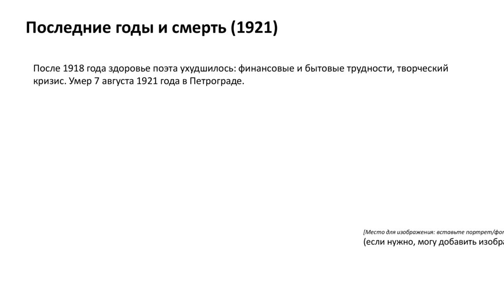 Последние годы и смерть (1921)После 1918 года здоровье поэта ухудшилось: финансовые и бытовые трудности, творческий