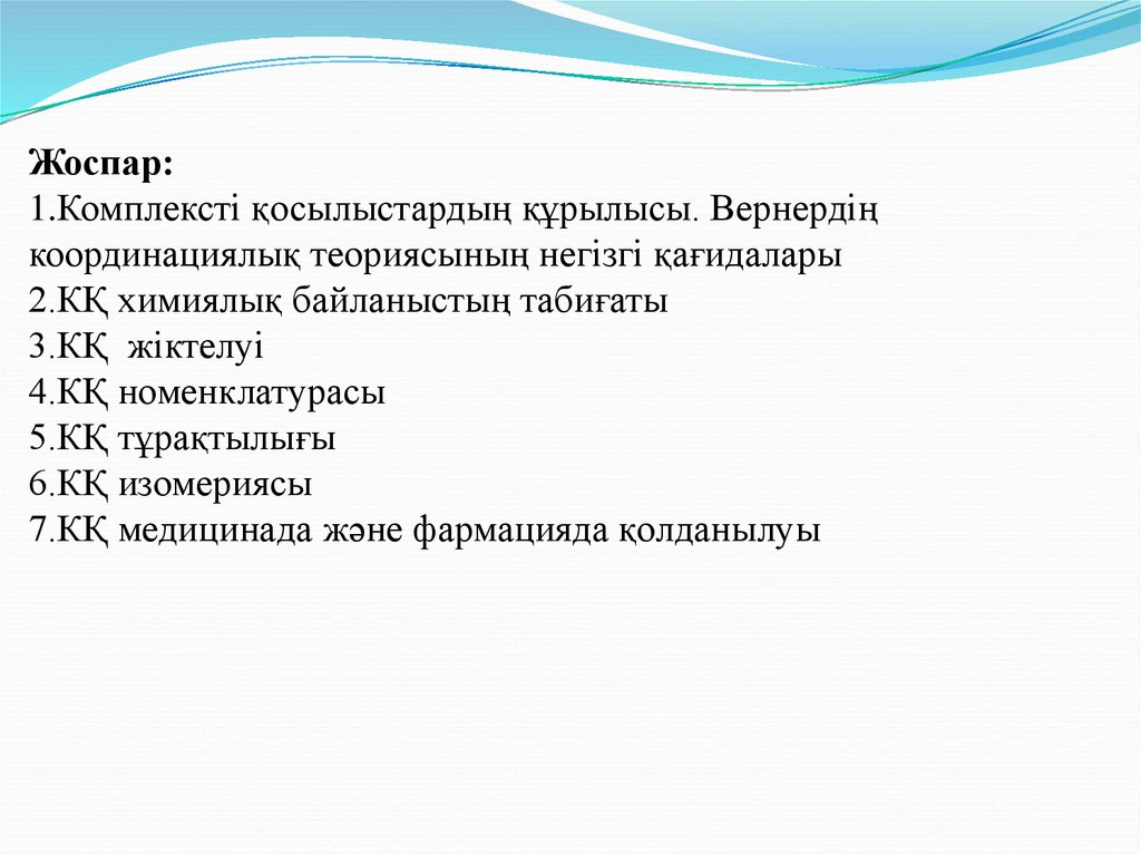 Жоспар:1.Комплексті қосылыстардың құрылысы. Вернердің