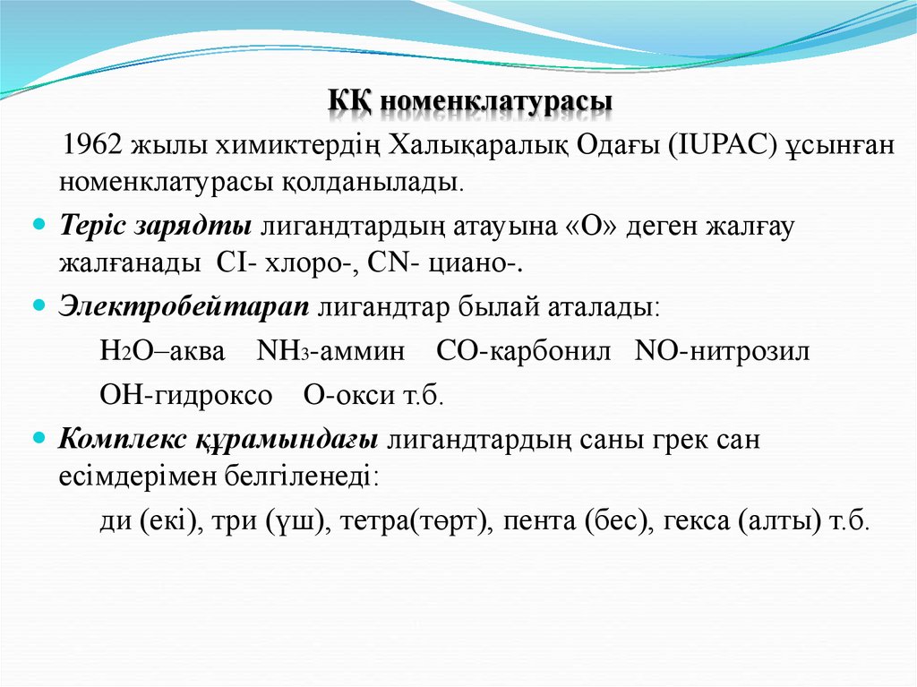 КҚ номенклатурасы1962 жылы химиктердің Халықаралық Одағы (ІUPAC) ұсынған