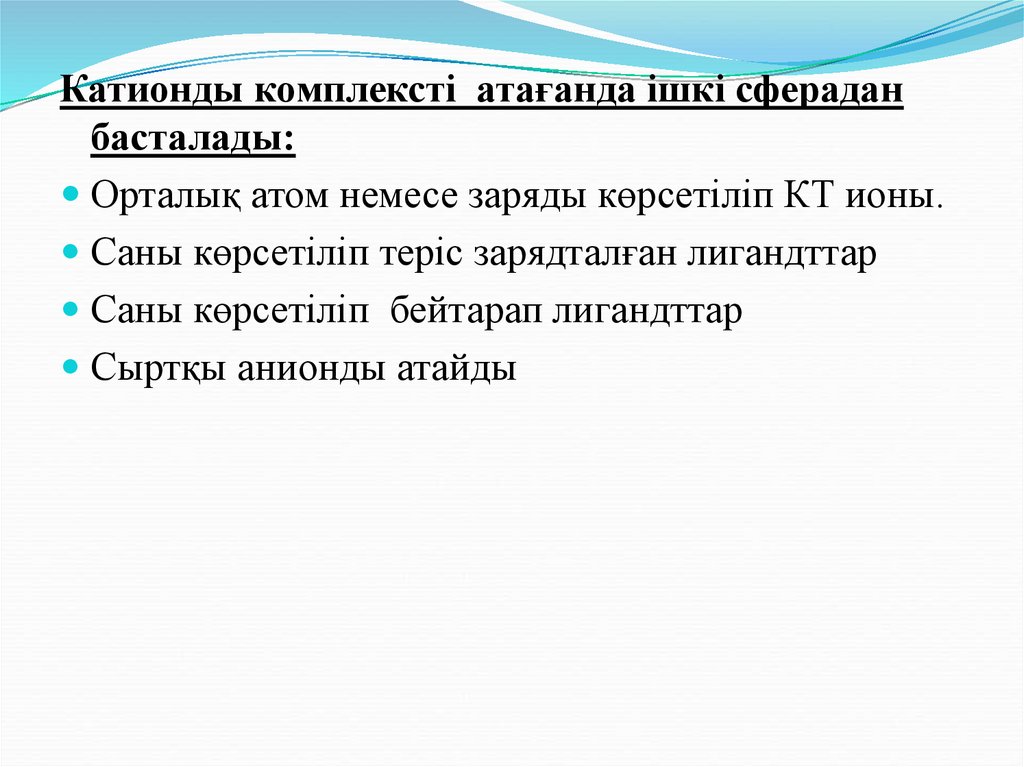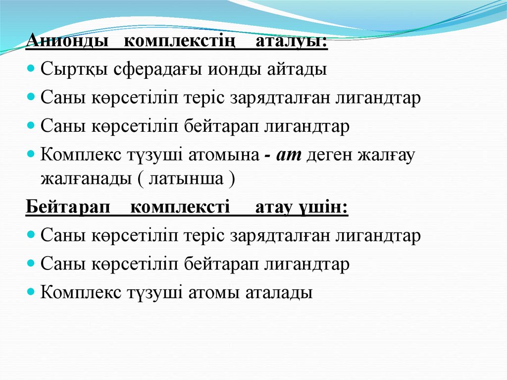 Анионды комплекстің аталуы:Сыртқы сферадағы ионды айтады