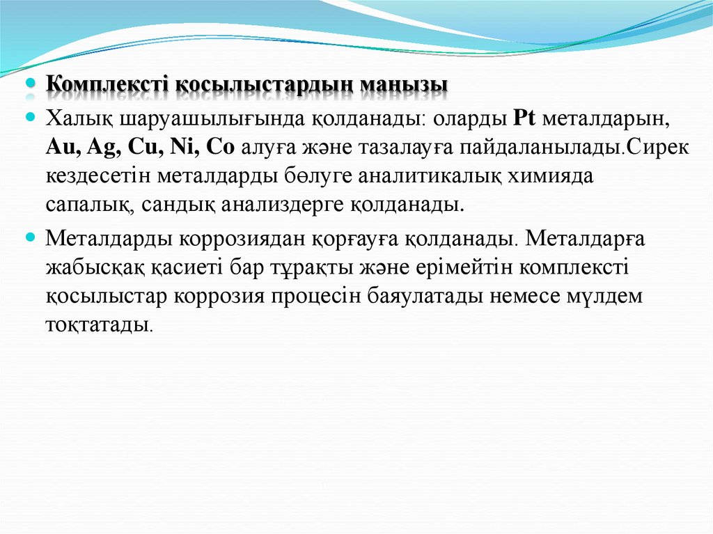 Комплексті қосылыстардың маңызыХалық шаруашылығында қолданады: оларды Pt металдарын,