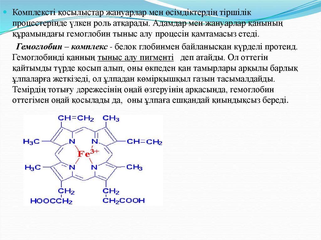 Комплексті қосылыстар жануарлар мен өсімдіктердің тіршілікпроцестерінде үлкен роль атқарады. Адамдар мен жануарлар қанының