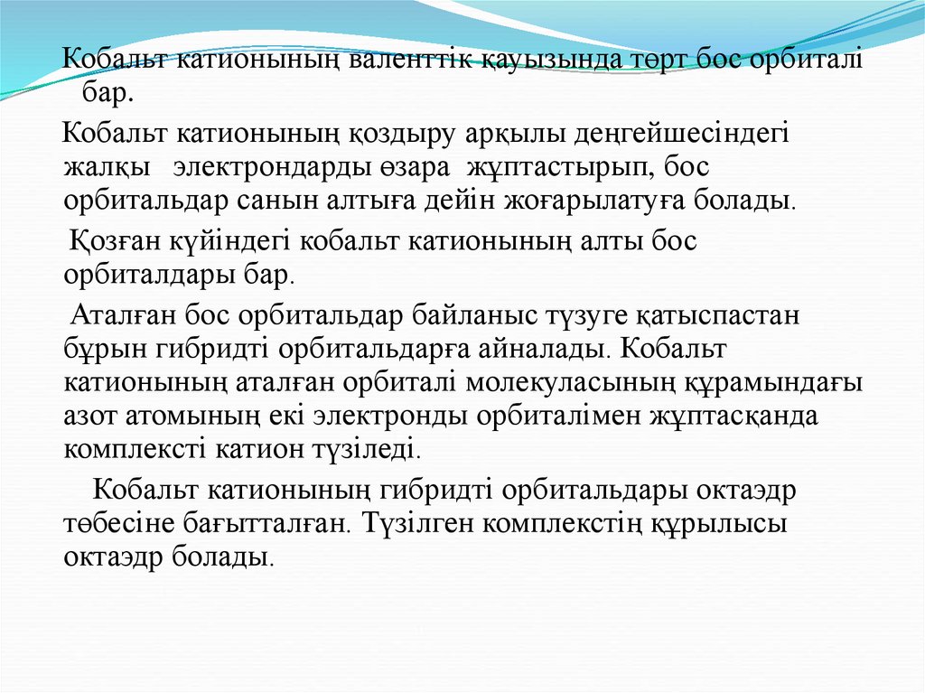 Кобальт катионының валенттік қауызында төрт бос орбиталібар.