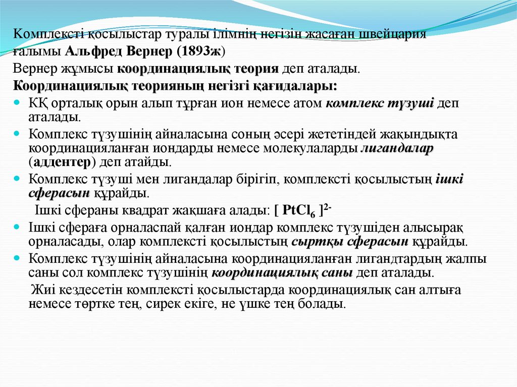 Kомплексті қосылыстар туралы ілімнің негізін жасаған швейцарияғалымы Альфред Вернер (1893ж)