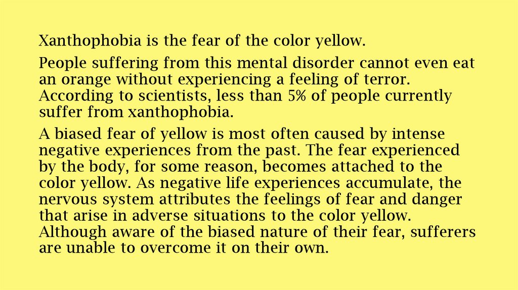 Xanthophobia is the fear of the color yellow.People suffering from this mental disorder cannot even eat