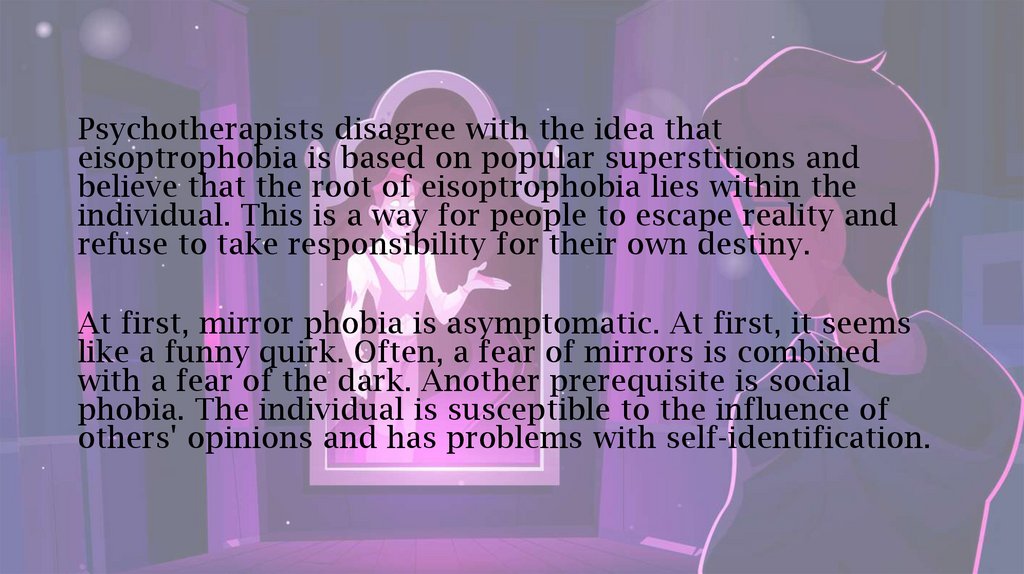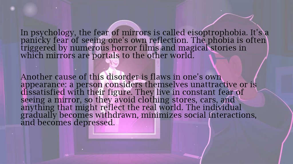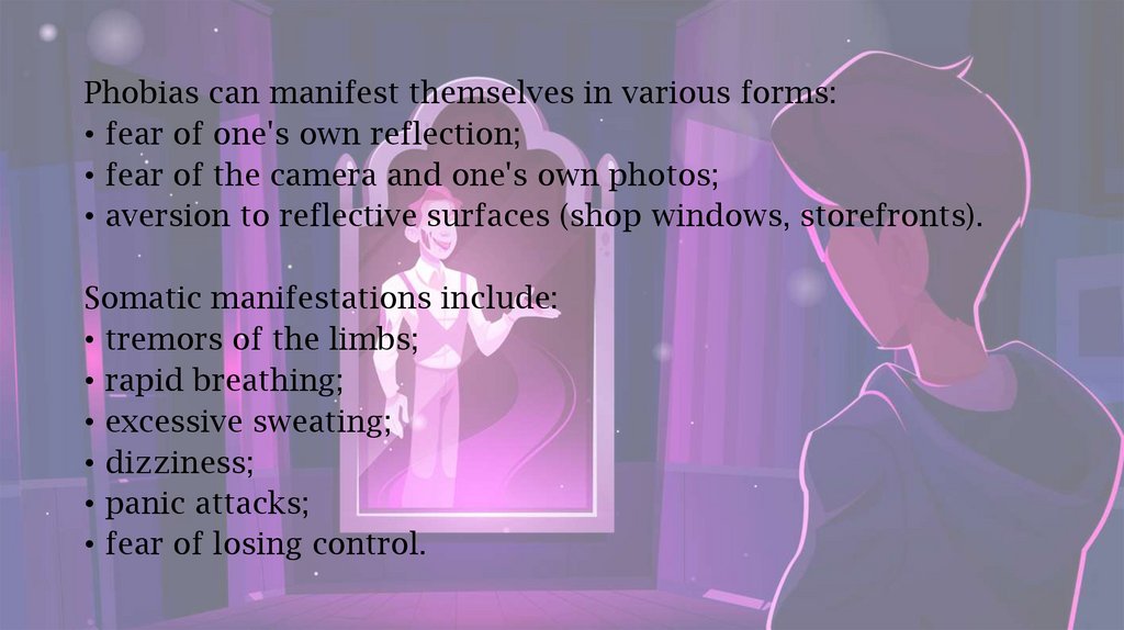 Phobias can manifest themselves in various forms:• fear of one's own reflection;