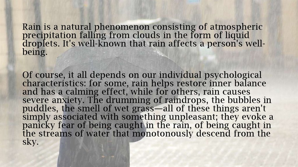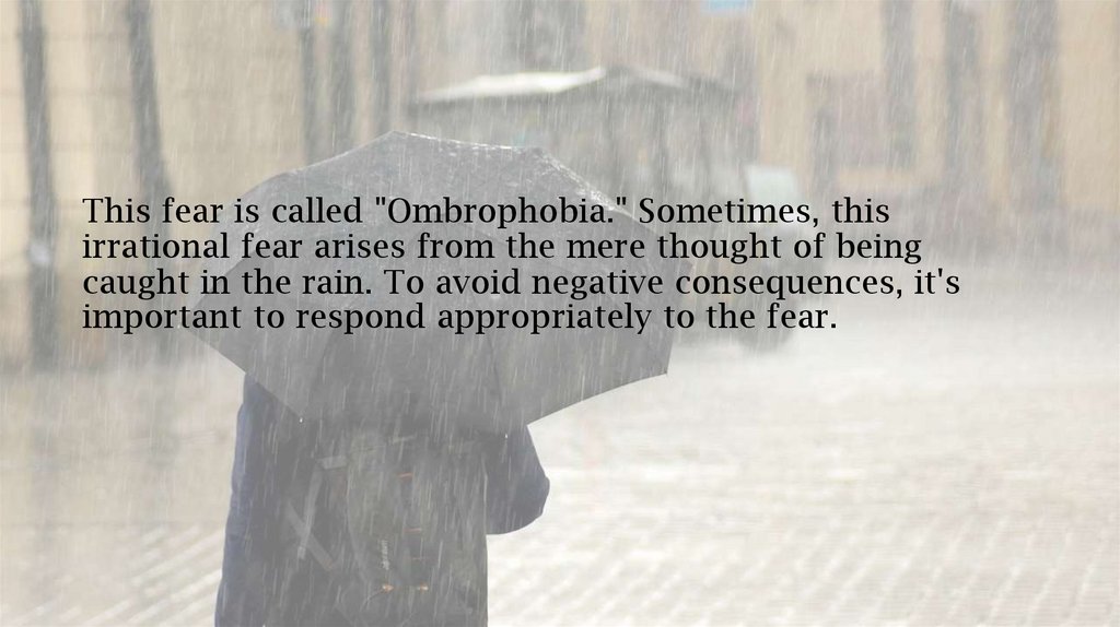 This fear is called "Ombrophobia." Sometimes, thisirrational fear arises from the mere thought of being