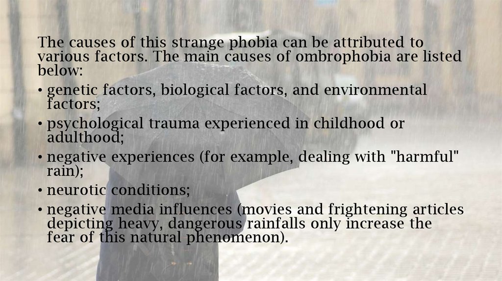 The causes of this strange phobia can be attributed tovarious factors. The main causes of ombrophobia are listed