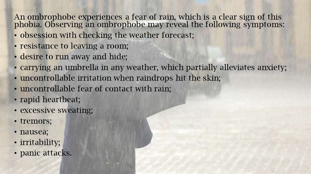 An ombrophobe experiences a fear of rain, which is a clear sign of thisphobia. Observing an ombrophobe may reveal the following symptoms: