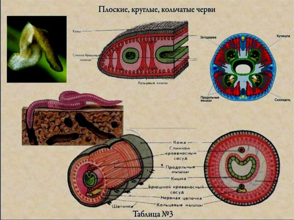тело покрыто эпителиально-мускульные клетками8. Плоские черви, круглые черви, кольчатые черви: