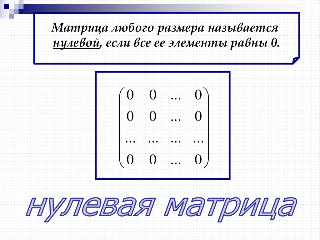 Матрица любого размера называетсянулевой, если все ее элементы равны 0.