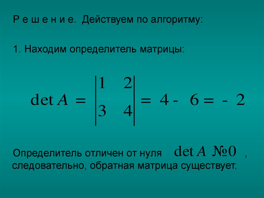 Р е ш е н и е. Действуем по алгоритму:1. Находим определитель матрицы:
