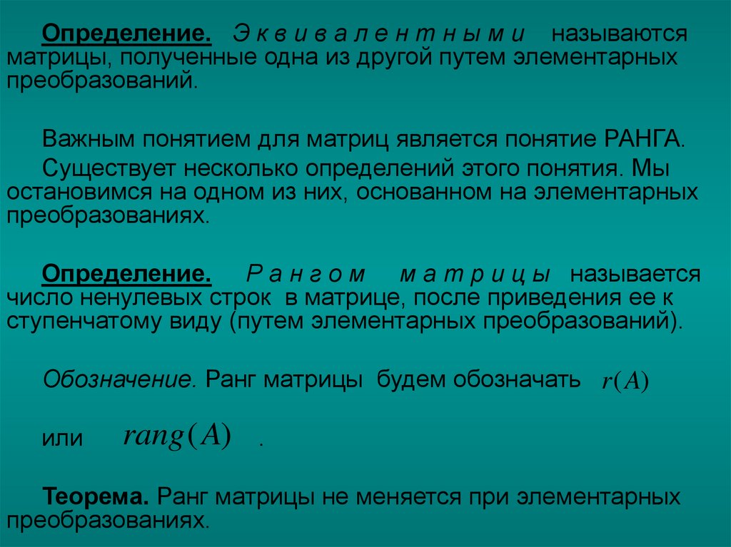 Определение. Э к в и в а л е н т н ы м и называютсяматрицы, полученные одна из другой путем элементарных