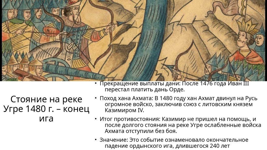 • Прекращение выплаты дани: После 1476 года Иван IIIперестал платить дань Орде.
