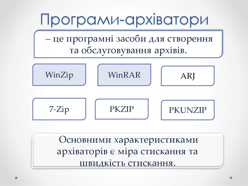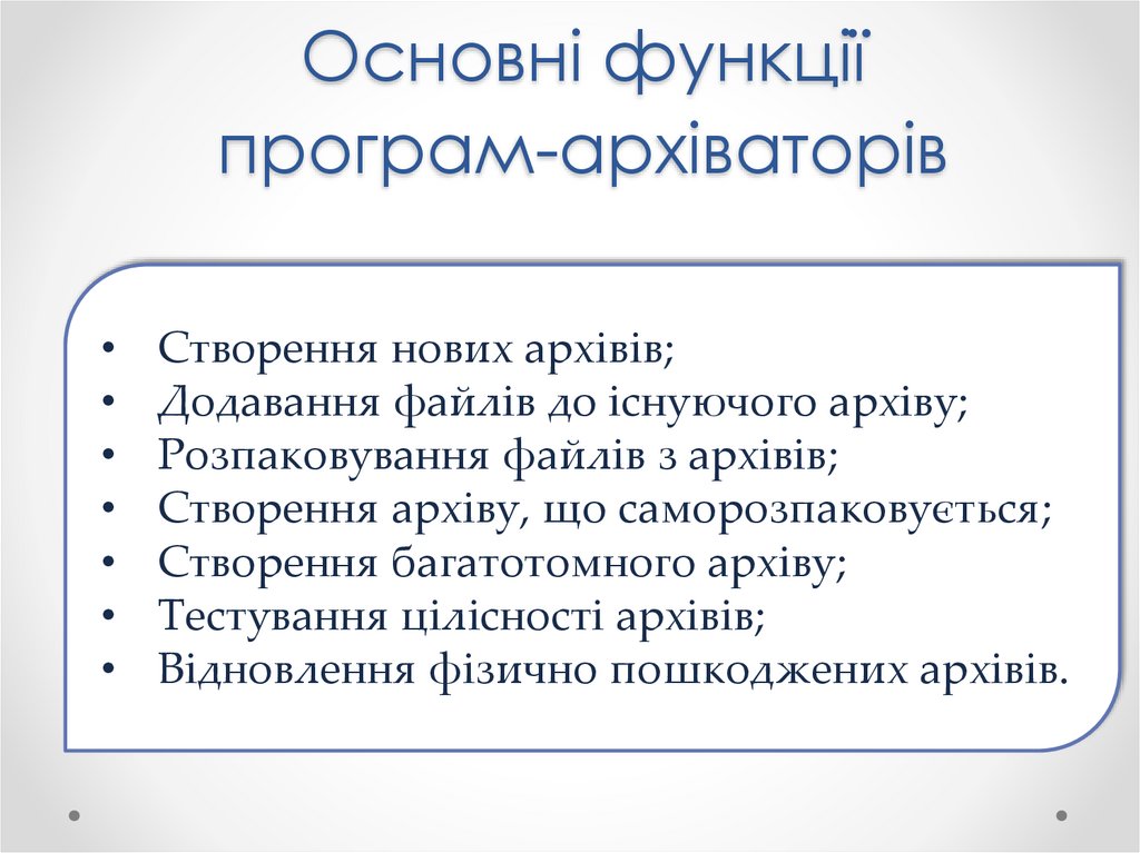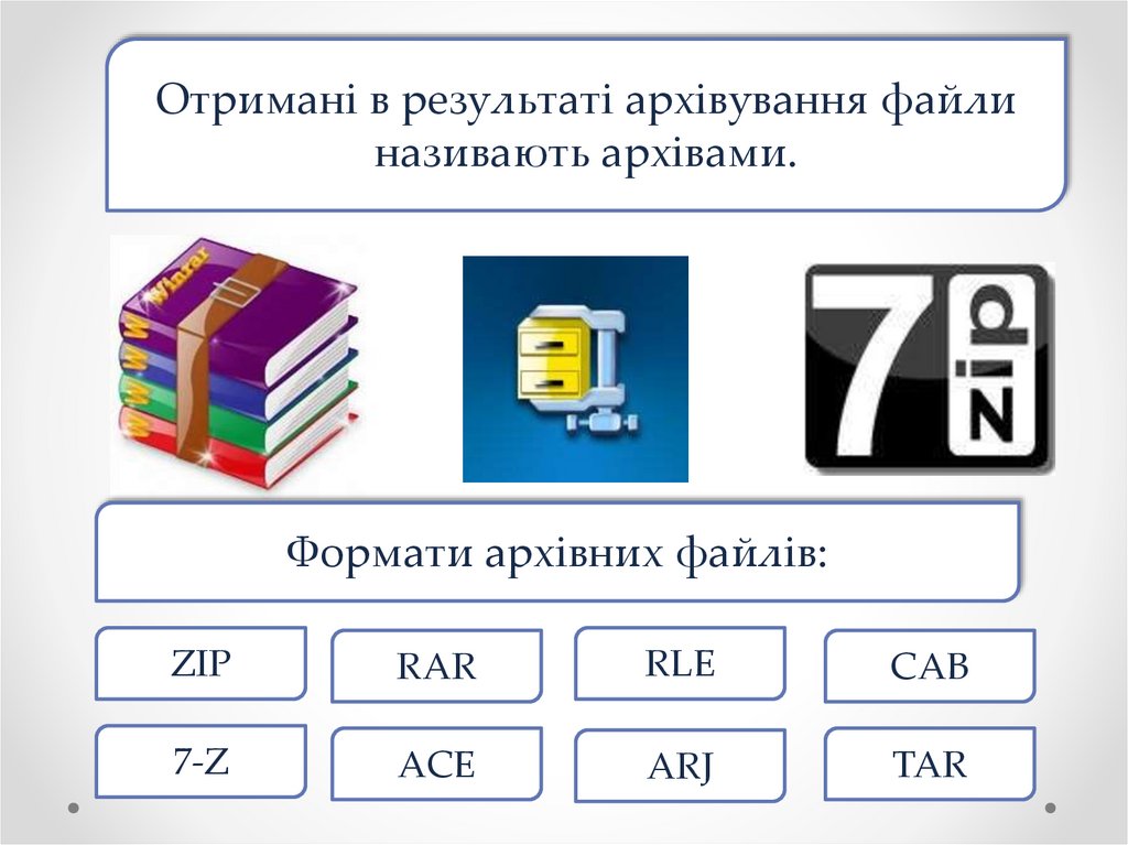 • Розглянути принципи стиснення інформації;• Розглянути призначення програм-архіваторів;