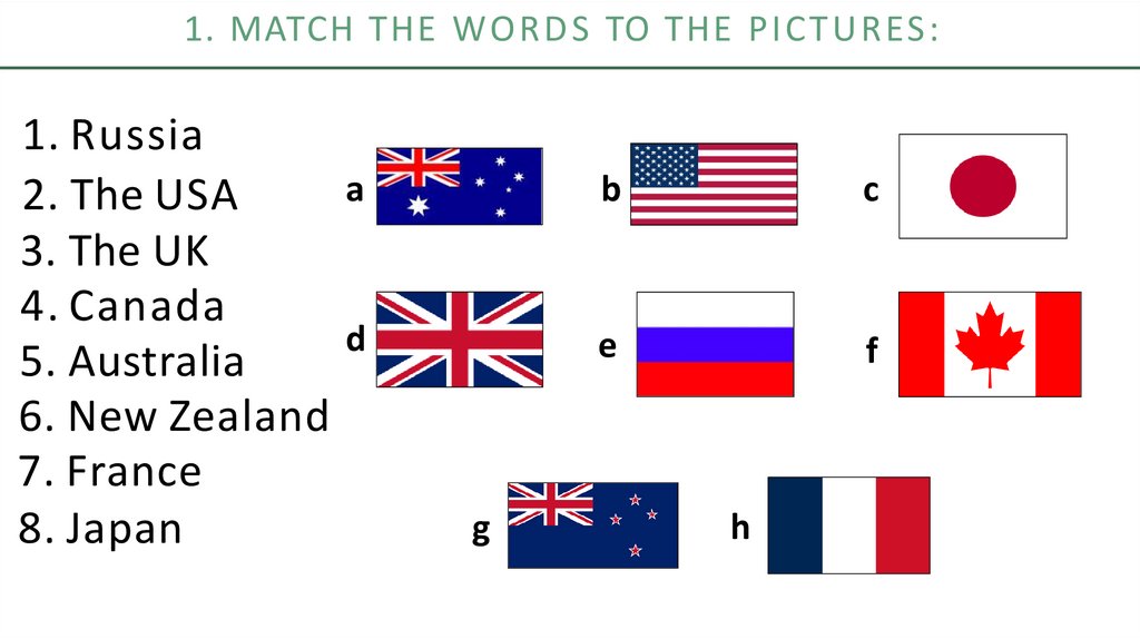 1. MATCH THE WO R D S TO THE P I C T U R ES :1. Russia