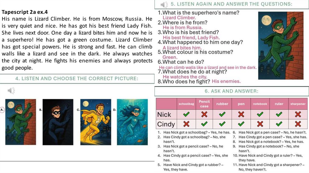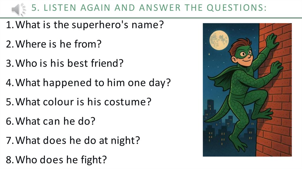 5. LISTEN AGAIN AND ANSW ER THE Q UESTIO NS :1. What is the superhero's name?