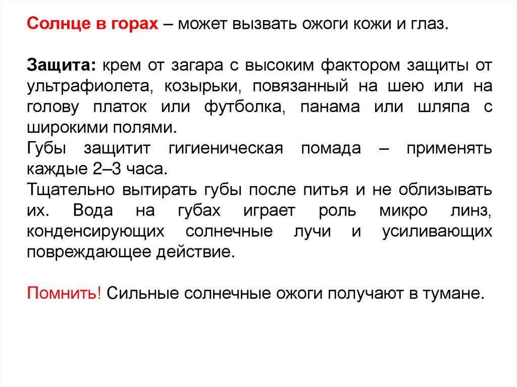 Солнце в горах – может вызвать ожоги кожи и глаз.Защита: крем от загара с высоким фактором защиты от