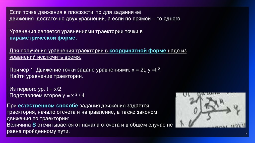 Если точка движения в плоскости, то для задания еёдвижения достаточно двух уравнений, а если по прямой – то одного.