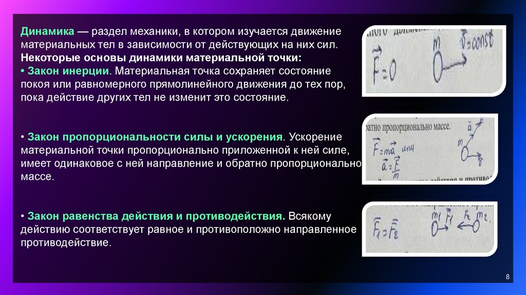 Динамика — раздел механики, в котором изучается движениематериальных тел в зависимости от действующих на них сил.