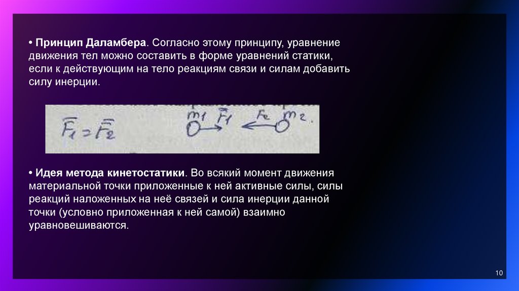 • Принцип Даламбера. Согласно этому принципу, уравнениедвижения тел можно составить в форме уравнений статики,