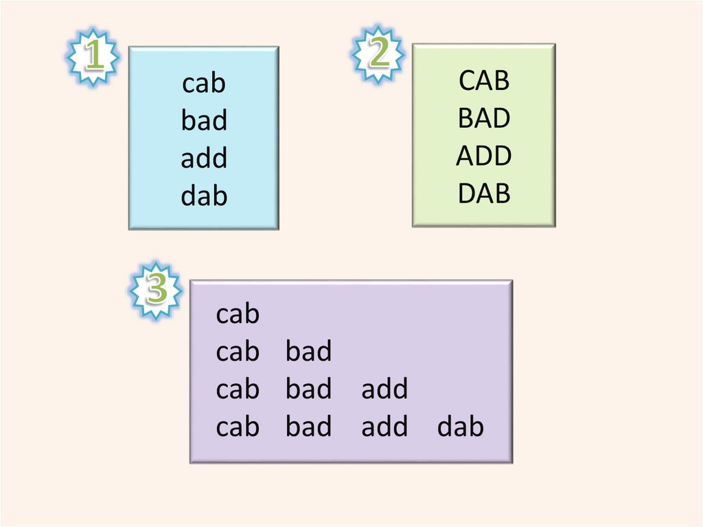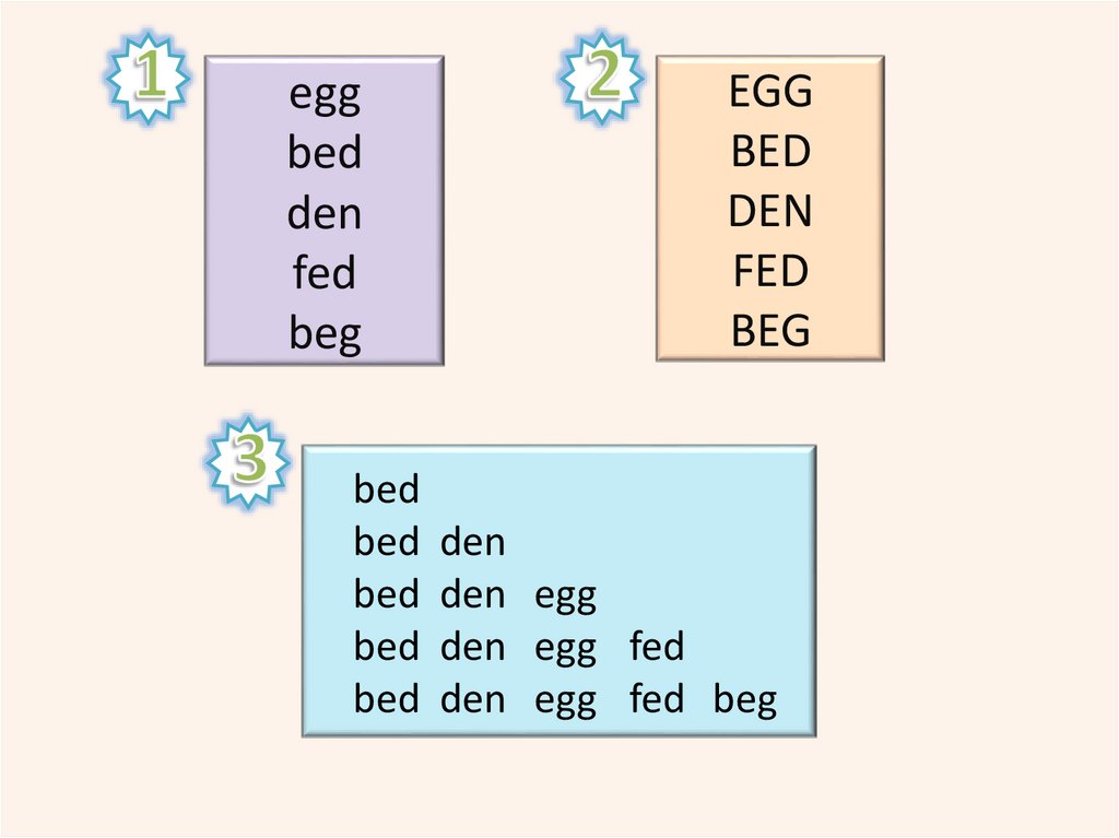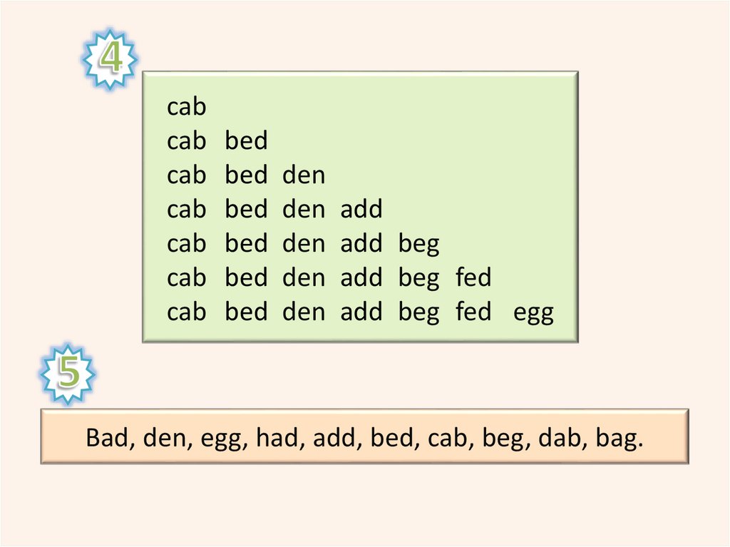 Bad, den, egg, had, add, bed, cab, beg, dab, bag.