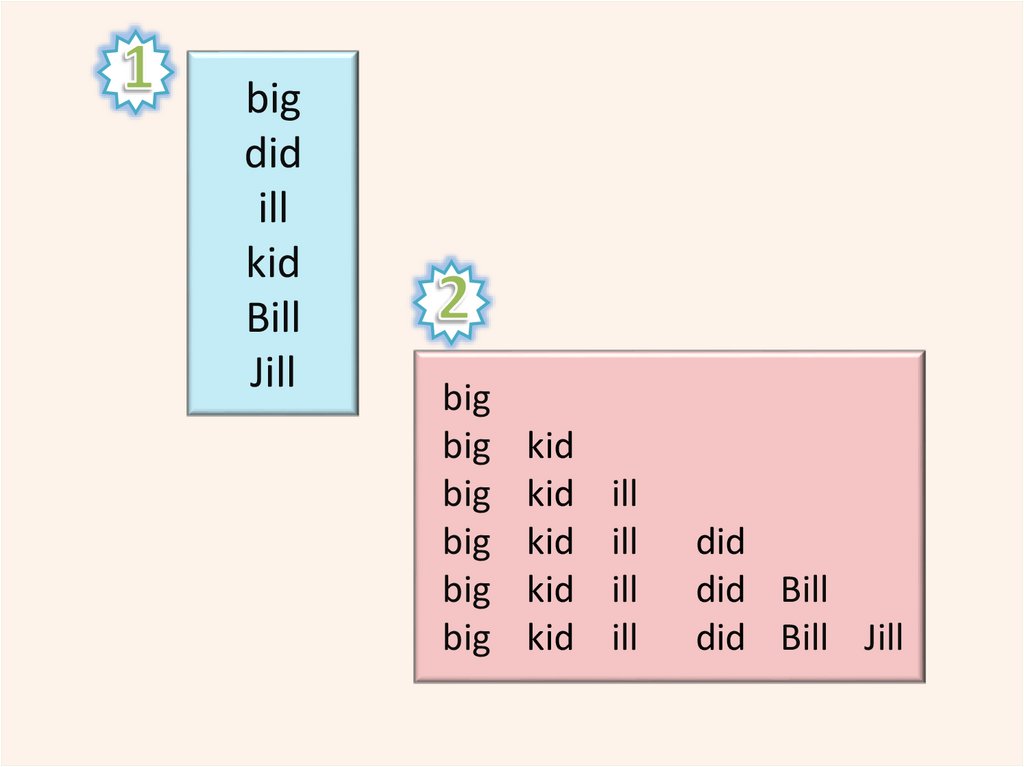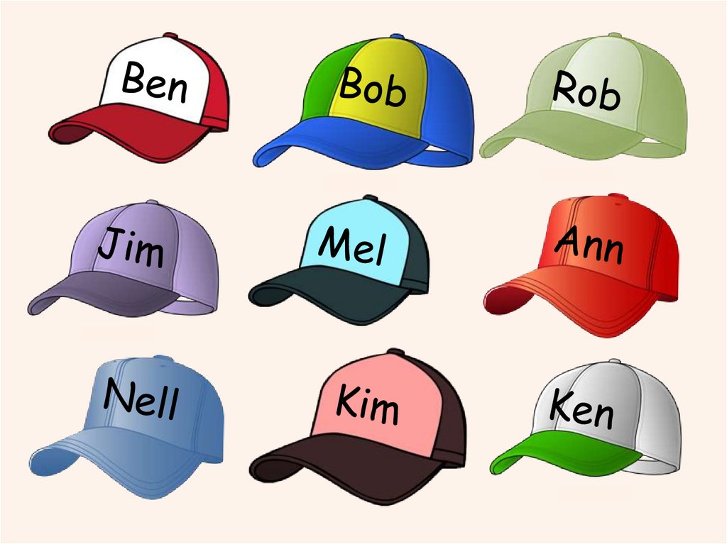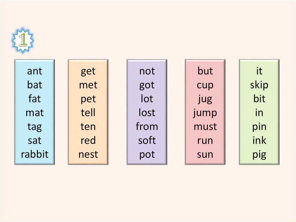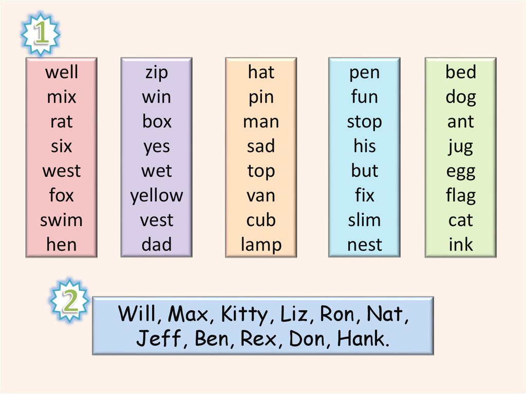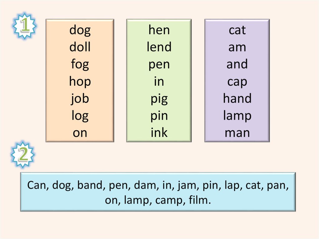 Can, dog, band, pen, dam, in, jam, pin, lap, cat, pan,
