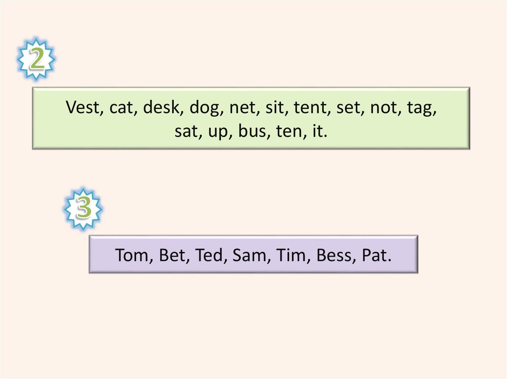 Vest, cat, desk, dog, net, sit, tent, set, not, tag,sat, up, bus, ten, it.