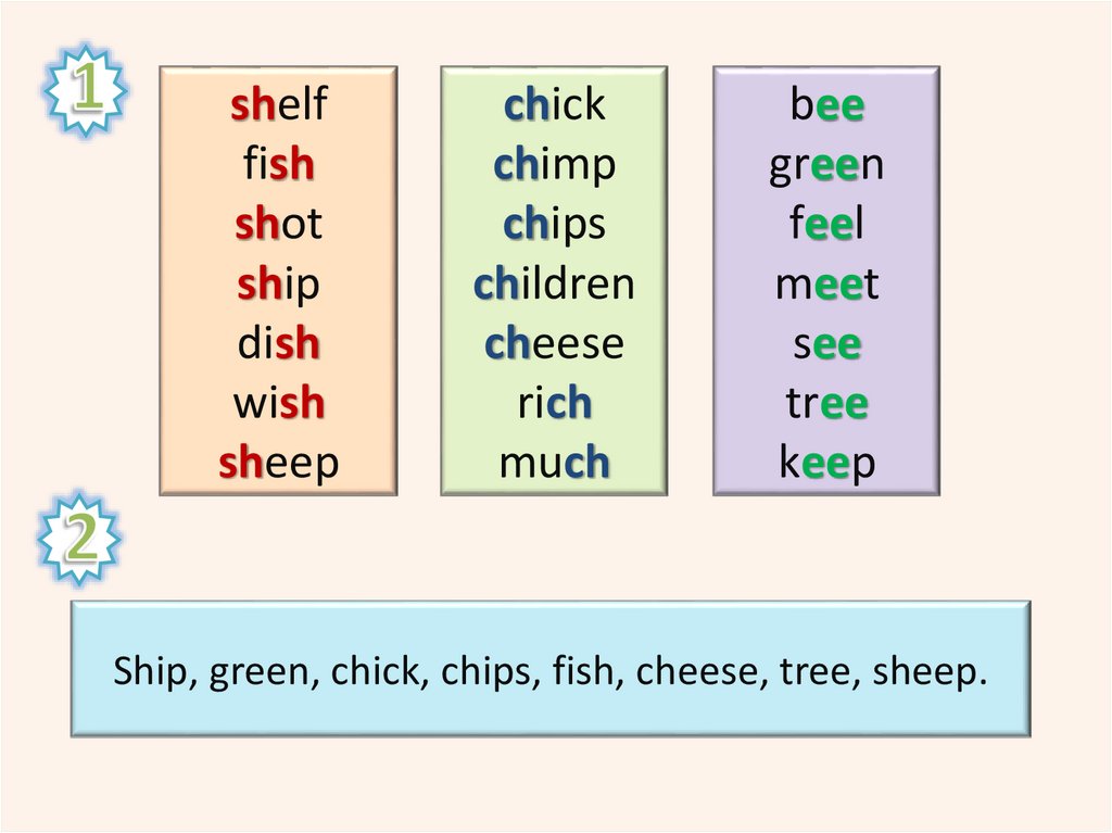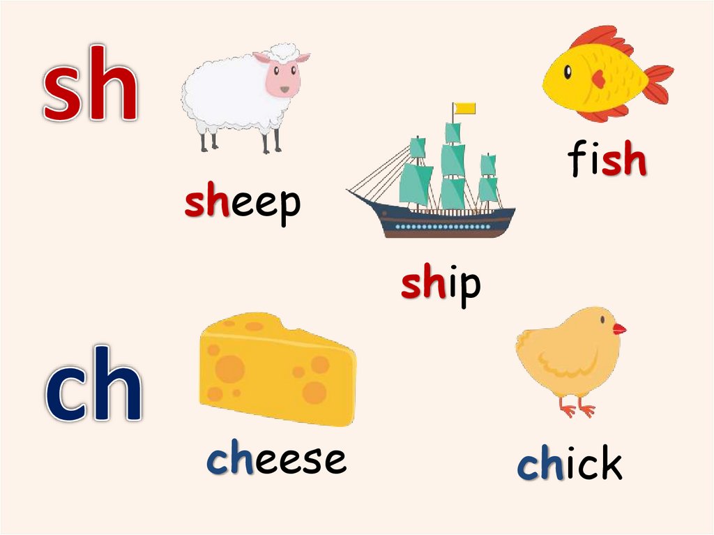 Ship, green, chick, chips, fish, cheese, tree, sheep.