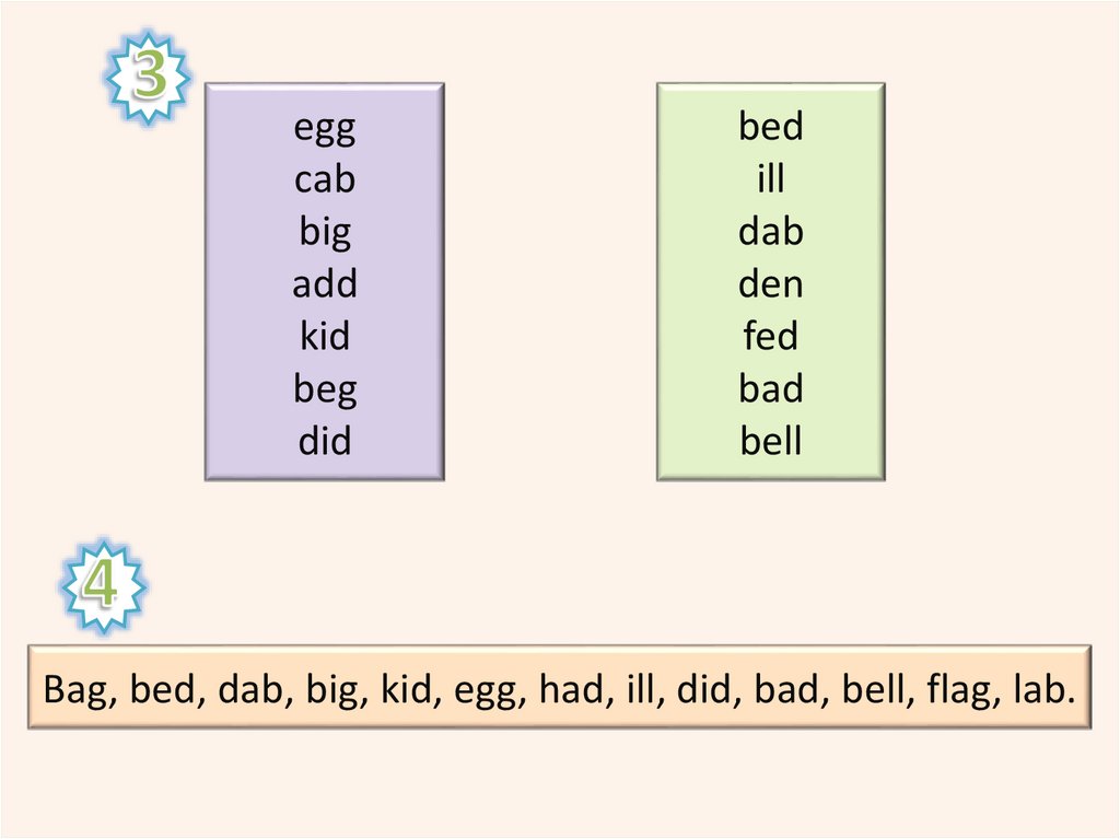 Bag, bed, dab, big, kid, egg, had, ill, did, bad, bell, flag, lab.