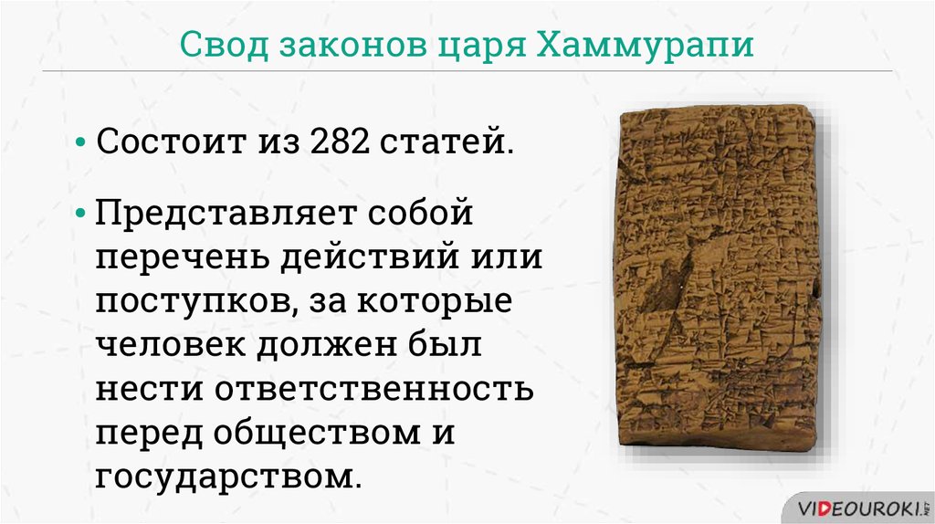 Свод законов царя ХаммурапиСостоит из 282 статей.