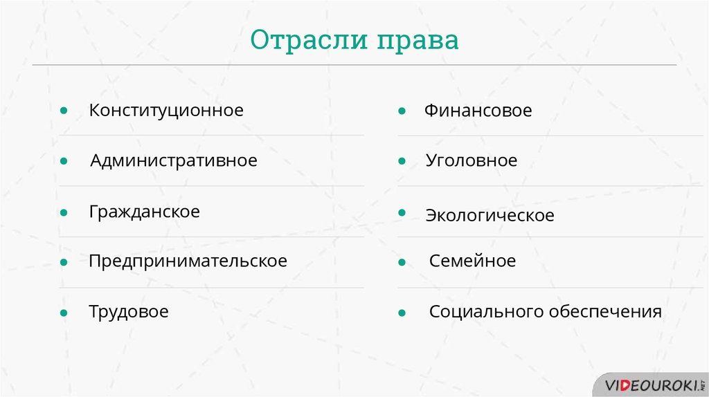 Принято выделять следующие отрасли права: конституционное