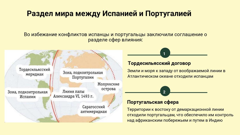 Раздел мира между Испанией и ПортугалиейВо избежание конфликтов испанцы и португальцы заключили соглашение о