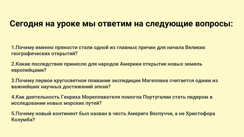 Сегодня на уроке мы ответим на следующие вопросы:1.Почему именно пряности стали одной из главных причин для начала Великих