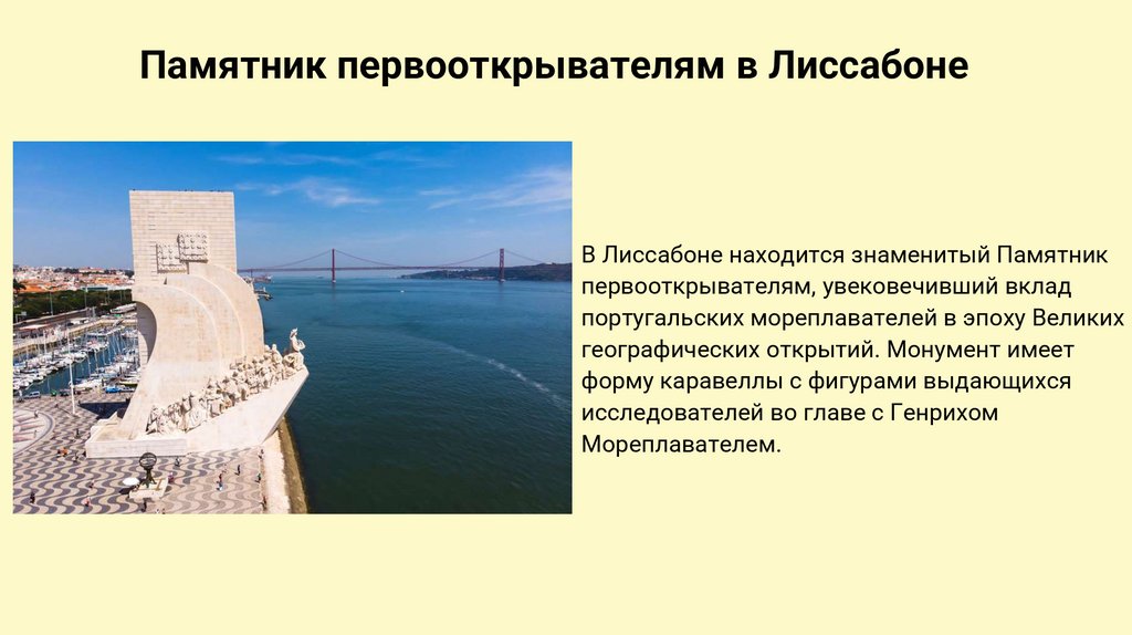 Памятник первооткрывателям в ЛиссабонеВ Лиссабоне находится знаменитый Памятник