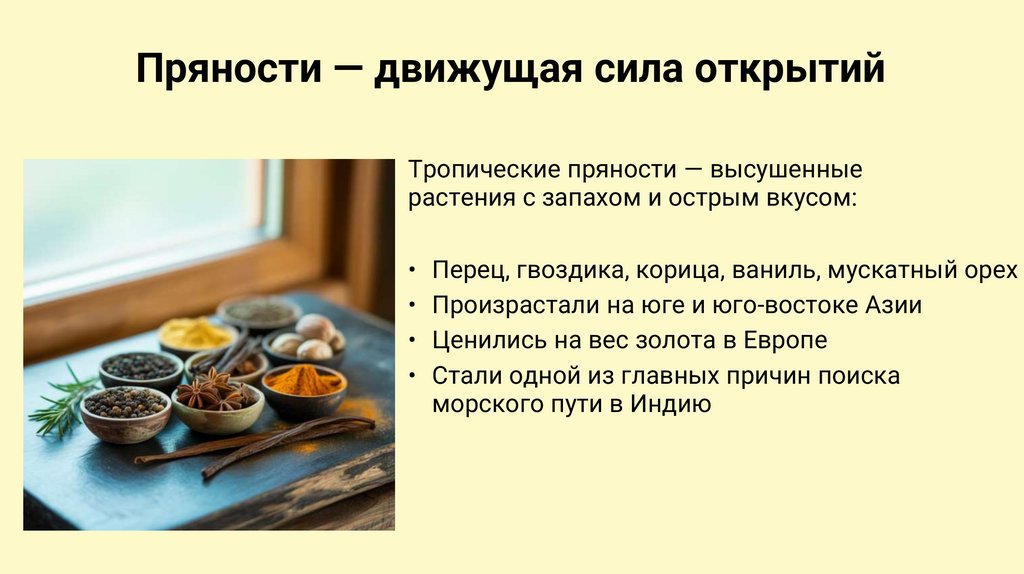 Пряности — движущая сила открытийТропические пряности — высушенные