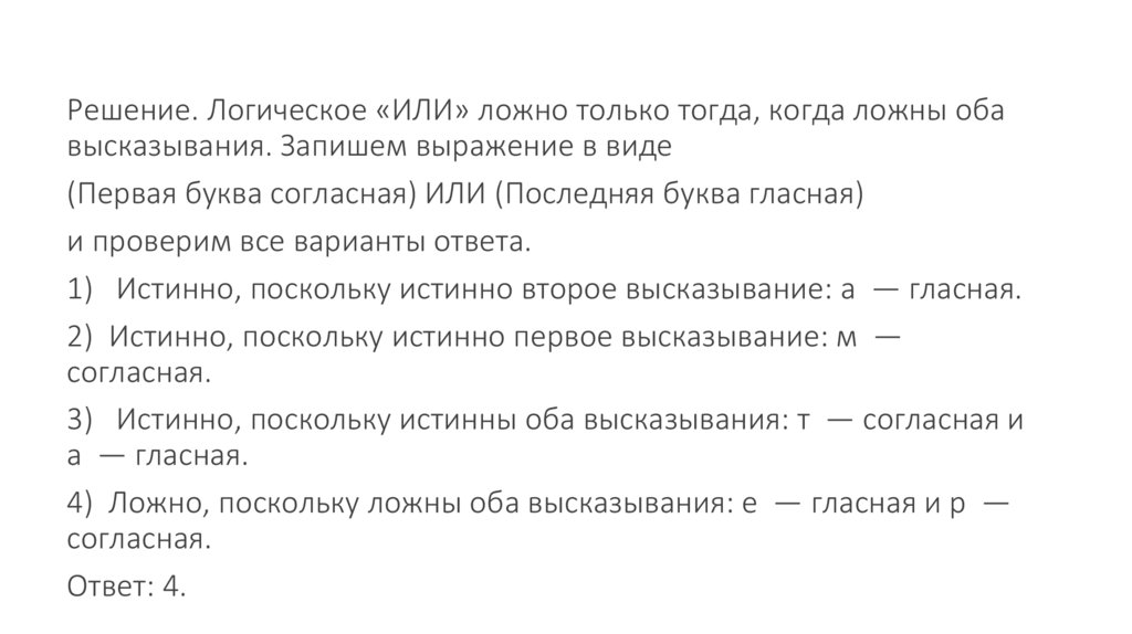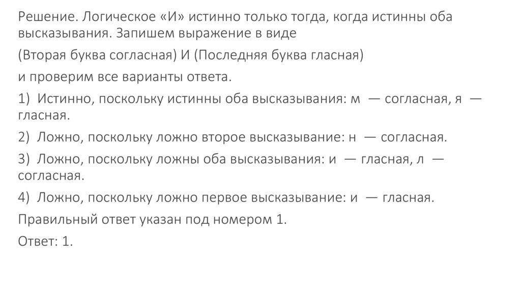4) Ложно, поскольку ложно первое высказывание: и — гласная.